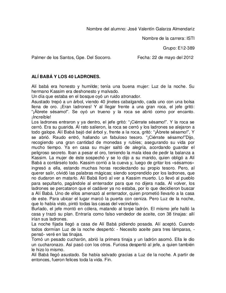 Cuando el jefe va a buscar a sus hombres descubre que todos están abrasados y huye. Alibaba y los 40 ladrones Alí Babá era un pobre leñador que vivía con su esposa en un pequeño pueblecito dentro de las montañas allí. Los ladrones entraron y ya dentro el jefe gritó.